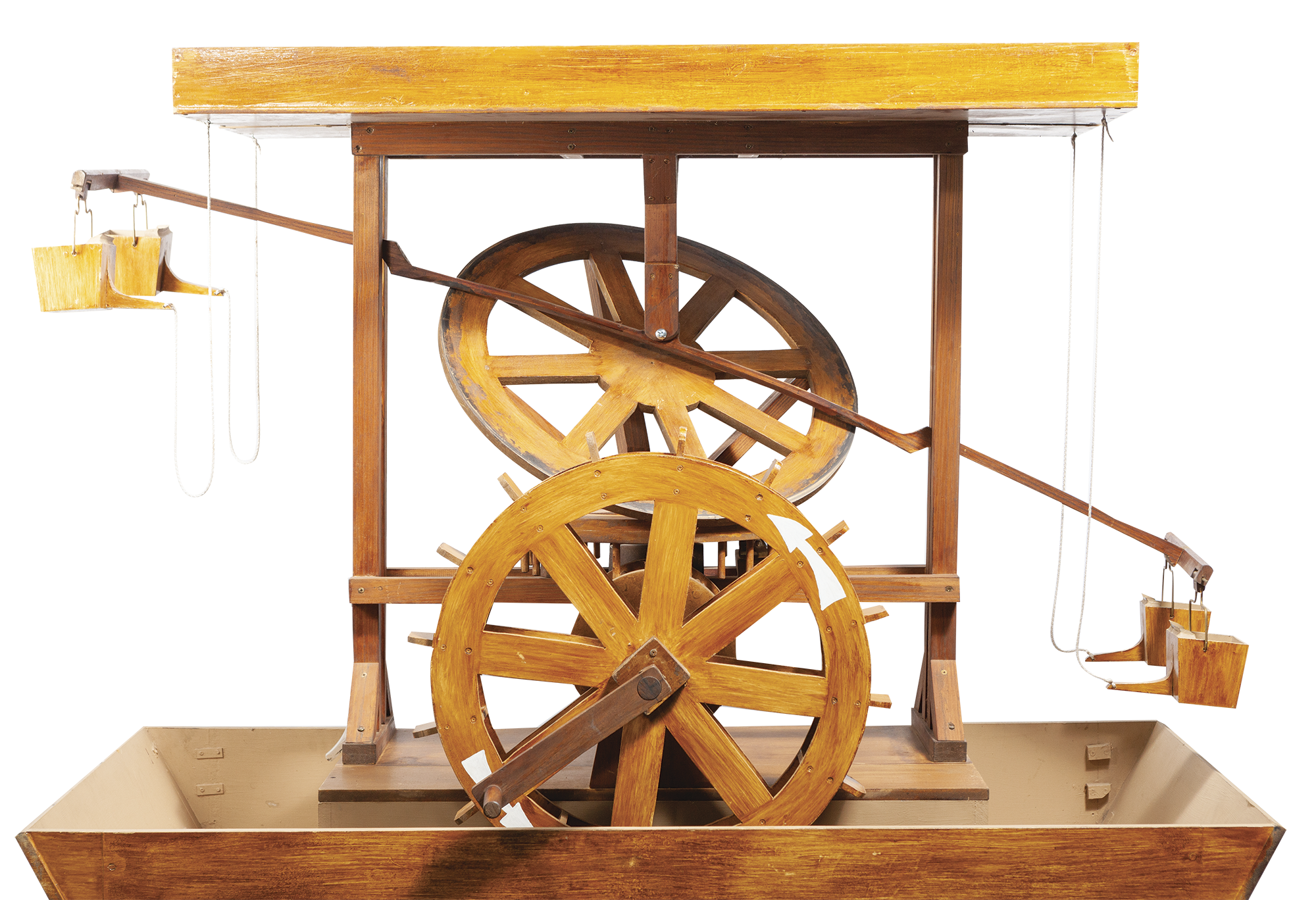Esta máquina hidráulica, diseñada por Leonardo da Vinci, aprovecha la energía generada por una noria instalada en un río o canal. La rotación de la noria impulsa una serie de ruedas dentadas conectadas a un disco oblicuo. Este sistema eleva de manera alternada una vara unida a dos baldes, que se llenan de agua al descender al nivel inferior y la descargan al ascender al nivel superior.
