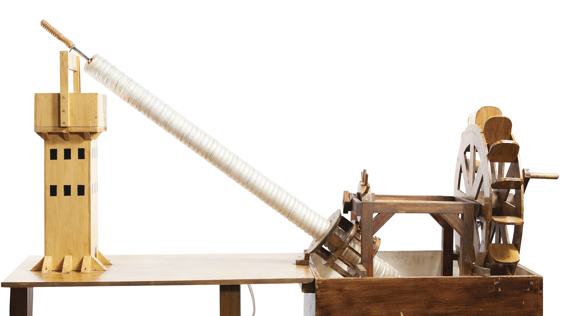 Inventos que exploran el potencial del agua como medio de transporte y fuente de energía. Estas réplicas incluyen máquinas para la navegación y mecanismos que aprovechan la fuerza del agua, reflejando la fascinación de Da Vinci por este elemento.