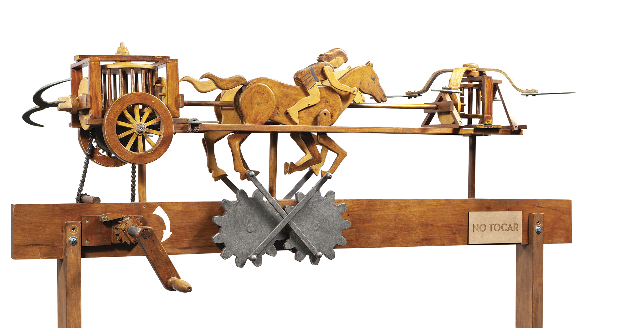 Este vehículo diseñado por Leonardo da Vinci utiliza el movimiento de avance para activar un sistema de cuchillas rotatorias. Un engranaje tipo jaula impulsa dos cuchillas posteriores, mientras que un sistema de cuchillas frontales corta eficientemente cualquier obstáculo en su camino. Con esta máquina, Leonardo buscaba soluciones tanto defensivas como ofensivas, mostrando su capacidad para integrar mecanismos complejos y eficientes en una estructura funcional destinada a mejorar la seguridad y efectividad en el campo.